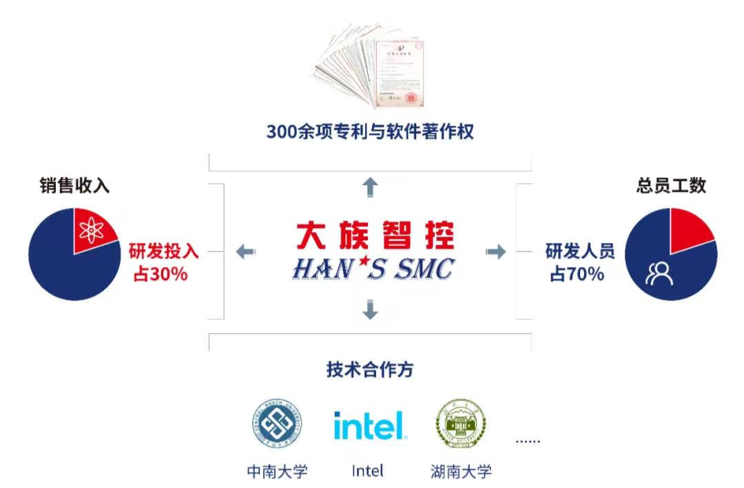 大族智控是智能制造领域一家具备核心技术竞争力的高新技术企业,公司目前拥有300余项专利及软件著作权,研发人员占比超过70%,研发投入占销售收入的比例高达30%;