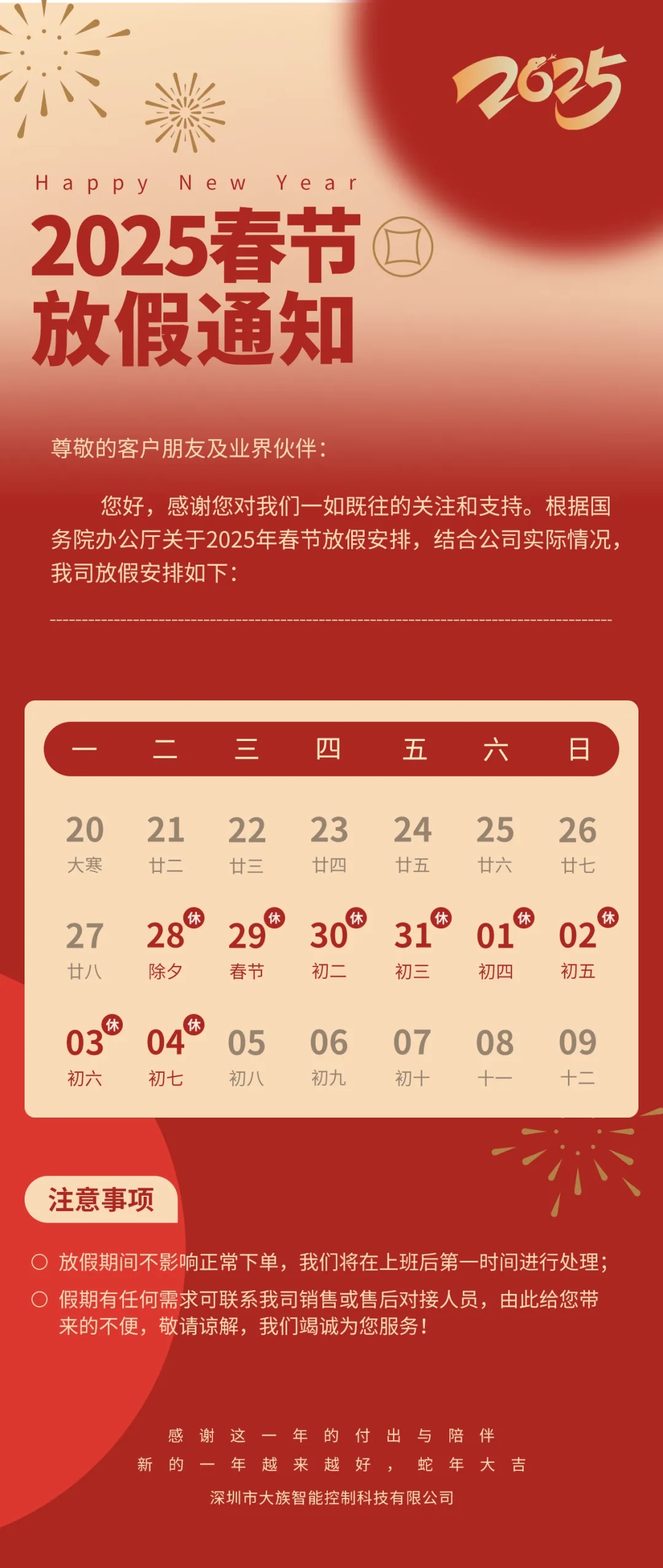 灵蛇贺岁,福满乾坤丨大族智控2025年春节放假通知