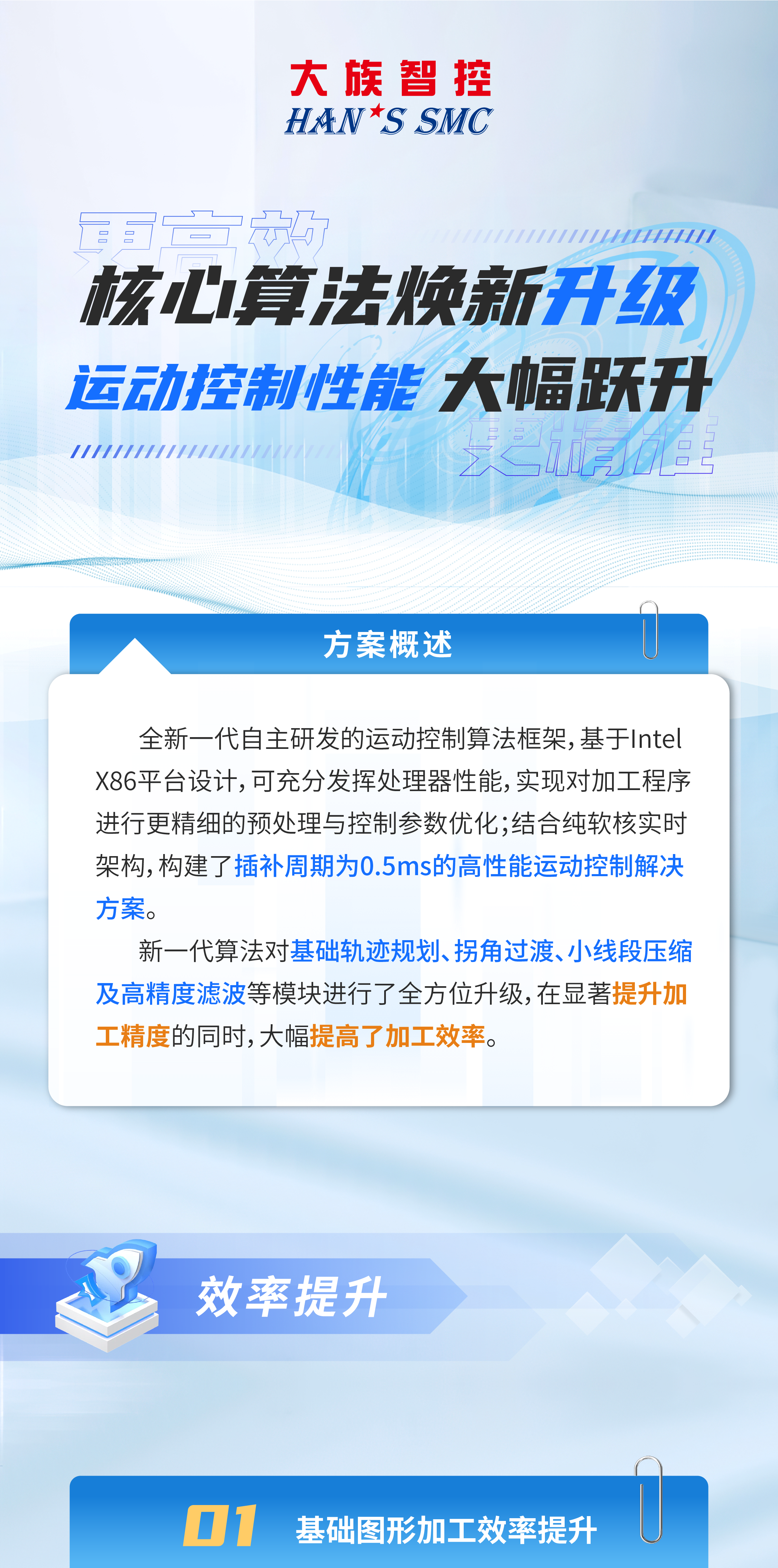 关键词:大族智控、核心算法换新升级、运动控制性能大幅提升、高性能运动控制解决方案、提升激光切割加工精度与效率、基础图形加工、小线段图形加工自适应调节、高速定位、柔性加工、全面优化运动曲线形态。