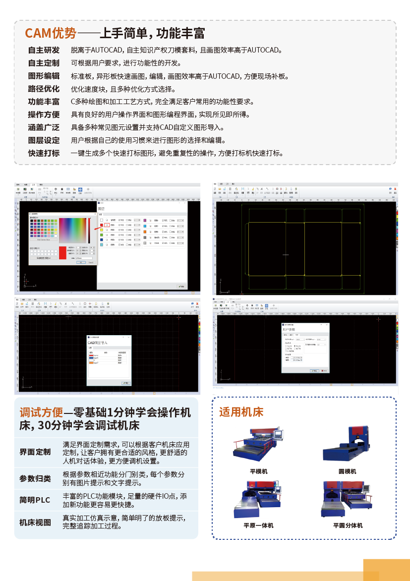 刀模加工中心主要是用于非金属行业,可以加工木制品、纸张、皮革、布料、有机玻璃、环氧树脂、亚克力、毛料、塑料、橡胶、瓷砖、水晶、玉石、竹制品等非金属材料,广泛运用于服装、皮革、布制玩具、电脑绣花裁剪、电子器、模型、工艺品、广告装饰、包装印制、纸制品等行业。我司立足于刀模加工行业,提供全套的智能控制解决方案。