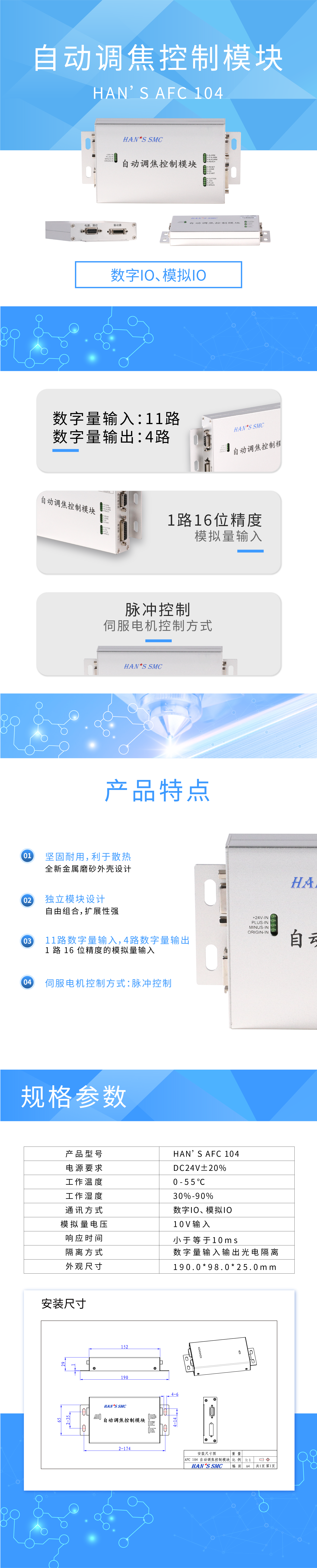 HAN'S AFC 104模块是本公司针对工业自动化控制推出的新一代产品,仅需几路数字量和1路模拟量,就可实现对1台伺服电机的控制,方便总线系统对非总线激光切割头的调焦控制。