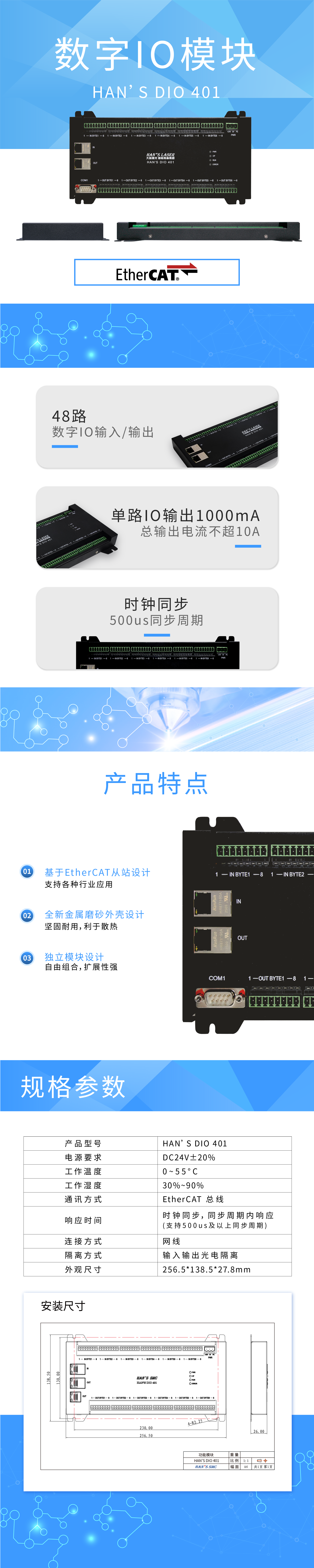 HAN’S DIO 401 数字量输出模块是基于EtherCAT总线技术设计的一款从站模块,提供48个数字量输出口,带光电隔离,大电流驱动输出。