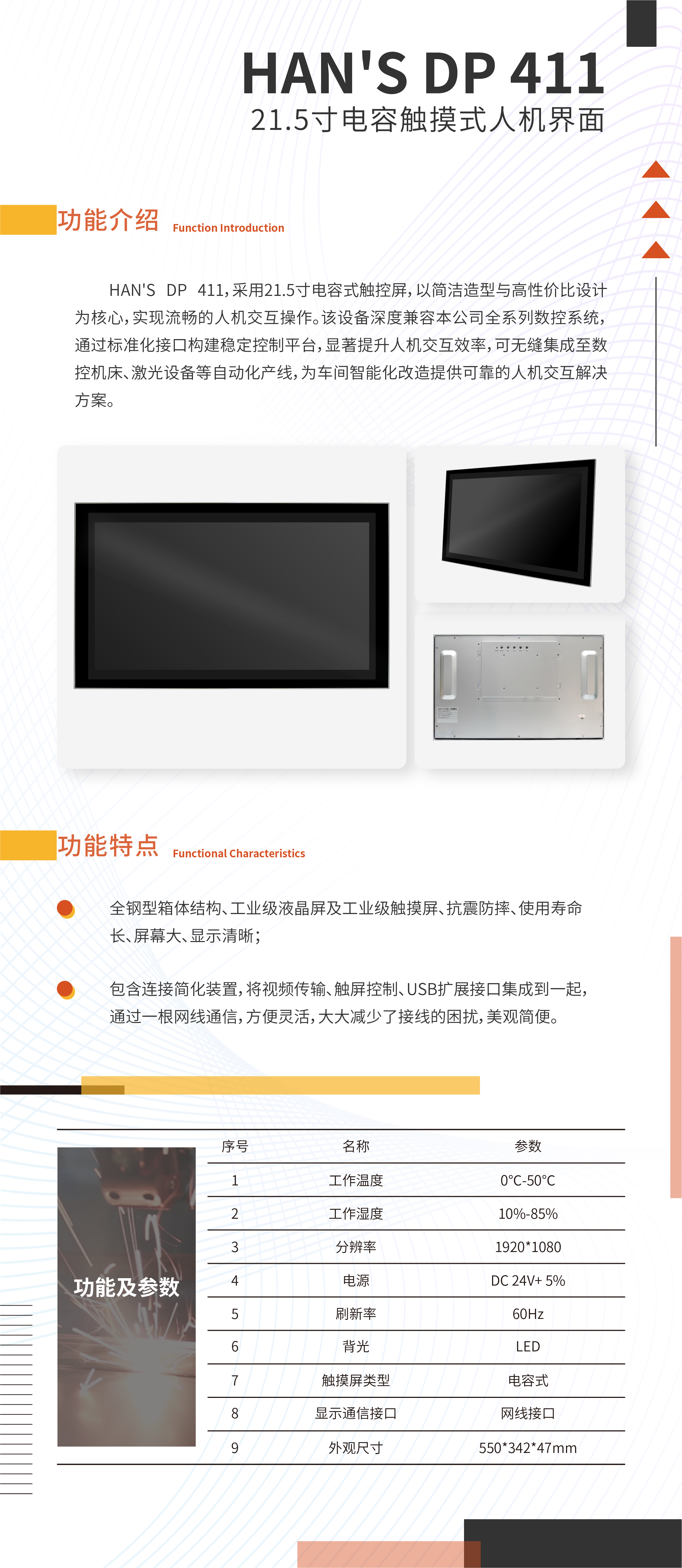 HAN'S DP 411,采用21.5寸电容式触控屏,以简洁造型与高性价比设计为核心,实现流畅的人机交互操作。该设备深度兼容本公司全系列数控系统,通过标准化接口构建稳定控制平台,显著提升人机交互效率,可无缝集成至数控机床、激光设备等自动化产线,为车间智能化改造提供可靠的人机交互解决方案。