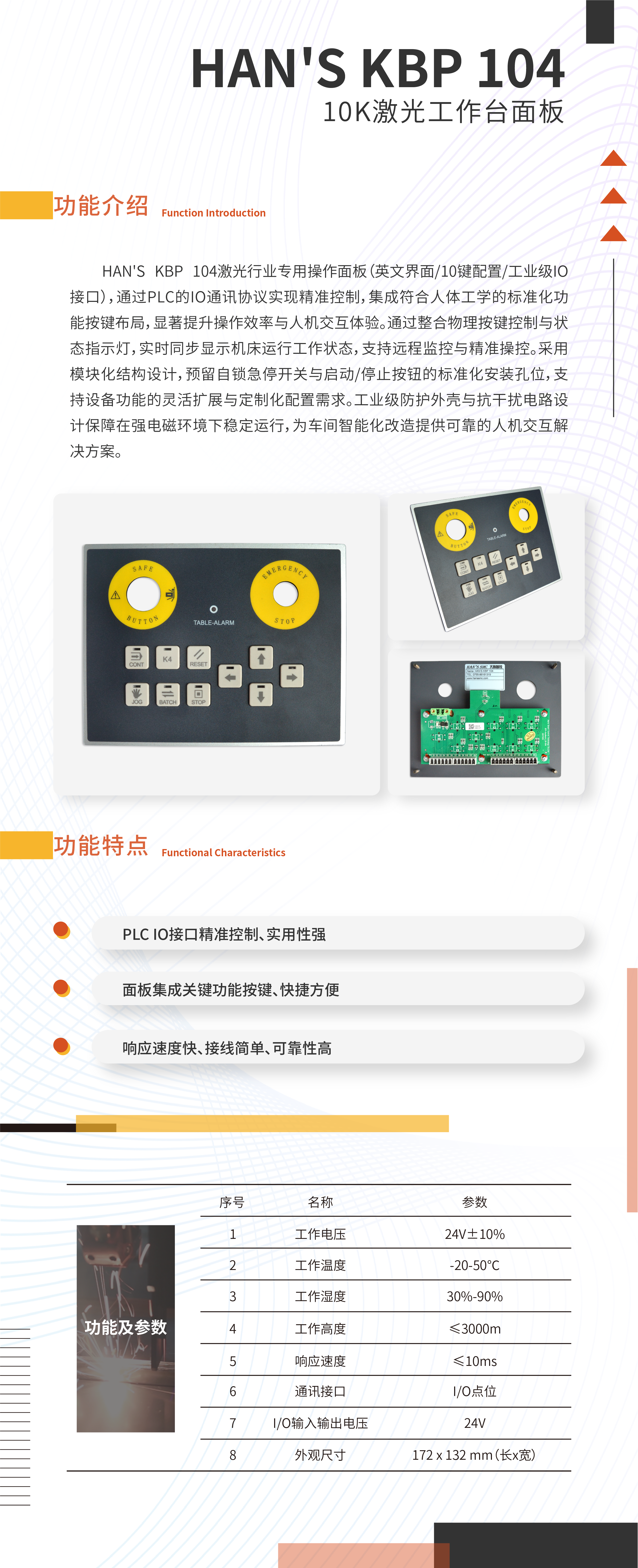 HAN'S KBP 104激光行业专用操作面板(英文界面/10键配置/工业级IO接口),通过PLC的IO通讯协议实现精准控制,集成符合人体工学的标准化功能按键布局,显著提升操作效率与人机交互体验。通过整合物理按键控制与状态指示灯,实时同步显示机床运行工作状态,支持远程监控与精准操控。采用模块化结构设计,预留自锁急停开关与启动/停止按钮的标准化安装孔位,支持设备功能的灵活扩展与定制化配置需求。工业级防护外壳与抗干扰电路设计保障在强电磁环境下稳定运行,为车间智能化改造提供可靠的人机交互解决方案。