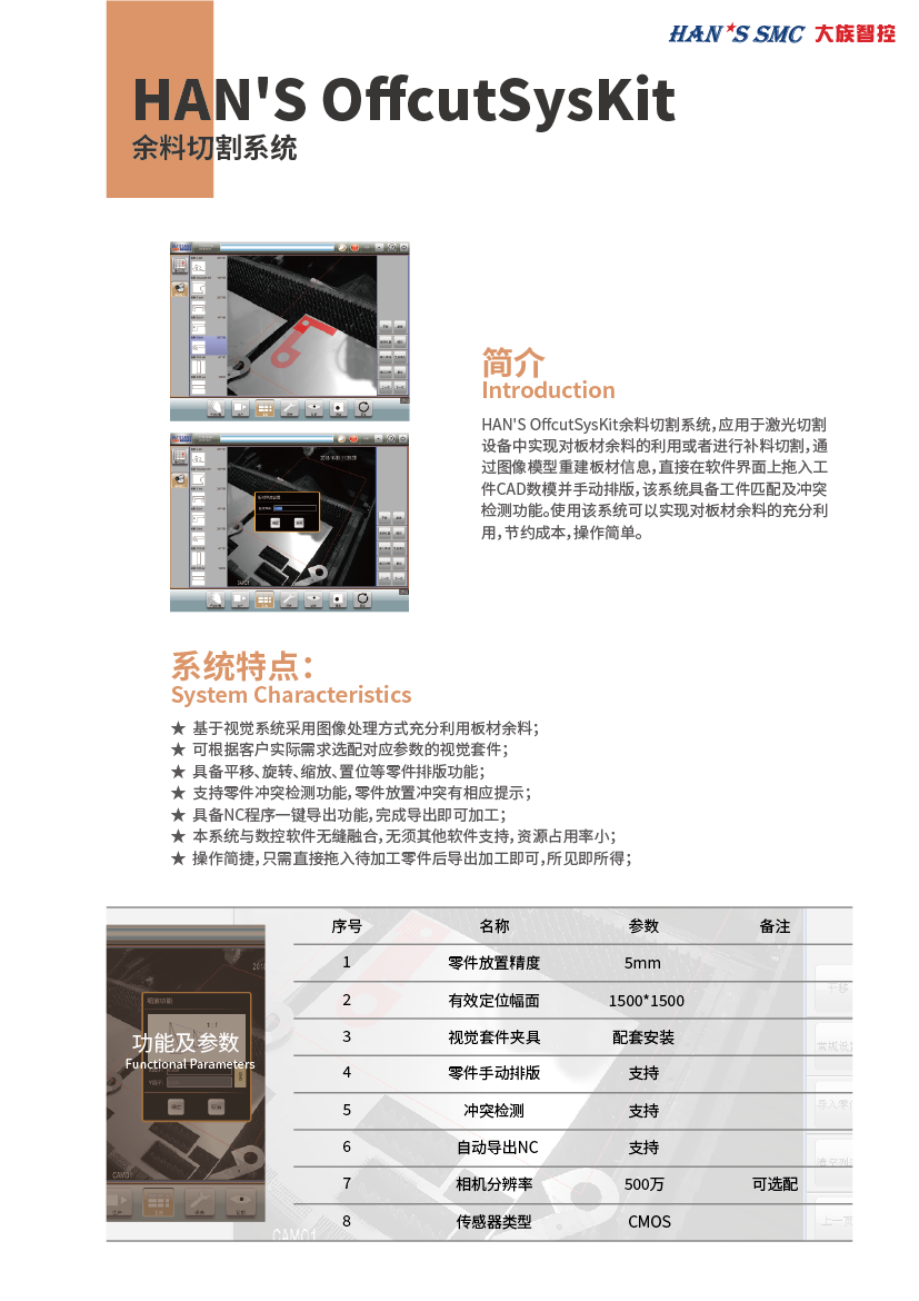 HAN'S OffcutSysKit切割余料系统,应用于激光切割设备中实现对板材余料的二次利用,采用机器视觉的方式充分发挥板材废料价值,通过图像模型重建板材信息、利用软件手动排版,并具备工件匹配及冲突检测功能。本系统可以最大限度的发挥板材的废料,节约成本,提高设备的加工效率,可用于激光切割的各类加工应用中。